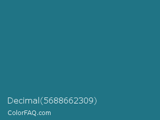 Decimal 5688662309 Color is a normal cyan color and the nearest color is Elm #1c7c7d. Hex code #207485 and RGB value is rgb(32,116,133). In RGB color space, this color is composed of 13% red, 45% green, 52% blue, In CMYK color space, this color is composed of 76% cyan, 13% magenta, 0% yellow , 48% black , In HSL color space, this color has a hue angle of 190° , 61% saturation and 32% lightness.