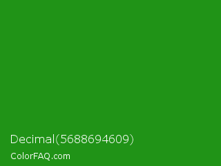 Decimal 5688694609 Color is a normal green color and the nearest color is Slimy Green #299617. Hex code #209317 and RGB value is rgb(32,147,23). In RGB color space, this color is composed of 13% red, 58% green, 9% blue, In CMYK color space, this color is composed of 78% cyan, 0% magenta, 84% yellow , 42% black , In HSL color space, this color has a hue angle of 116° , 73% saturation and 33% lightness.