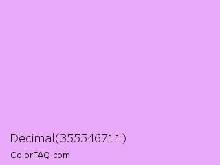 Decimal 355546711 Color is a very light purple color and the nearest color is Rich Brilliant Lavender #f1a7fe. Hex code #e9aaf9 and RGB value is rgb(233,170,249). In RGB color space, this color is composed of 91% red, 67% green, 98% blue, In CMYK color space, this color is composed of 6% cyan, 32% magenta, 0% yellow , 2% black , In HSL color space, this color has a hue angle of 288° , 87% saturation and 82% lightness.