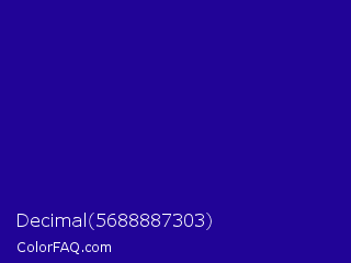 Decimal 5688887303 Color is a dark indigo color and the nearest color is Ultramarine #120a8f. Hex code #210497 and RGB value is rgb(33,4,151). In RGB color space, this color is composed of 13% red, 2% green, 59% blue, In CMYK color space, this color is composed of 78% cyan, 97% magenta, 0% yellow , 41% black , In HSL color space, this color has a hue angle of 252° , 95% saturation and 30% lightness.