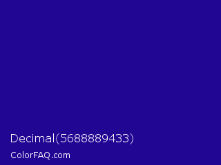 Decimal 5688889433 Color is a dark indigo color and the nearest color is Blue Gem #2c0e8c. Hex code #210593 and RGB value is rgb(33,5,147). In RGB color space, this color is composed of 13% red, 2% green, 58% blue, In CMYK color space, this color is composed of 78% cyan, 97% magenta, 0% yellow , 42% black , In HSL color space, this color has a hue angle of 252° , 93% saturation and 30% lightness.
