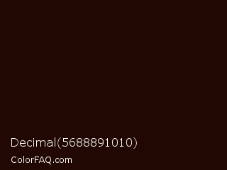 Decimal 5688891010 Color is a almost black red color and the nearest color is Kilamanjaro #240c02. Hex code #210802 and RGB value is rgb(33,8,2). In RGB color space, this color is composed of 13% red, 3% green, 1% blue, In CMYK color space, this color is composed of 0% cyan, 76% magenta, 94% yellow , 87% black , In HSL color space, this color has a hue angle of 12° , 89% saturation and 7% lightness.