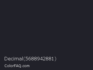 Decimal 5688942881 Color is a very dark blue color and the nearest color is Dark Gunmetal #1f262a. Hex code #212129 and RGB value is rgb(33,33,41). In RGB color space, this color is composed of 13% red, 13% green, 16% blue, In CMYK color space, this color is composed of 20% cyan, 20% magenta, 0% yellow , 84% black , In HSL color space, this color has a hue angle of 240° , 11% saturation and 15% lightness.