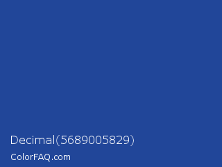 Decimal 5689005829 Color is a normal blue color and the nearest color is Sapphire #2f519e. Hex code #214699 and RGB value is rgb(33,70,153). In RGB color space, this color is composed of 13% red, 27% green, 60% blue, In CMYK color space, this color is composed of 78% cyan, 54% magenta, 0% yellow , 40% black , In HSL color space, this color has a hue angle of 222° , 65% saturation and 36% lightness.