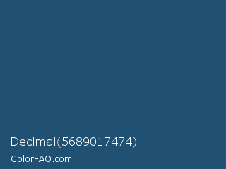 Decimal 5689017474 Color is a dark blue color and the nearest color is Chathams Blue #175579. Hex code #215172 and RGB value is rgb(33,81,114). In RGB color space, this color is composed of 13% red, 32% green, 45% blue, In CMYK color space, this color is composed of 71% cyan, 29% magenta, 0% yellow , 55% black , In HSL color space, this color has a hue angle of 204° , 55% saturation and 29% lightness.