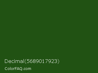 Decimal 5689017923 Color is a very dark green color and the nearest color is Green House #24500f. Hex code #215213 and RGB value is rgb(33,82,19). In RGB color space, this color is composed of 13% red, 32% green, 7% blue, In CMYK color space, this color is composed of 60% cyan, 0% magenta, 77% yellow , 68% black , In HSL color space, this color has a hue angle of 107° , 62% saturation and 20% lightness.