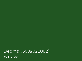 Decimal 5689022082 Color is a dark green color and the nearest color is Cal Poly Pomona Green #1e4d2b. Hex code #215622 and RGB value is rgb(33,86,34). In RGB color space, this color is composed of 13% red, 34% green, 13% blue, In CMYK color space, this color is composed of 62% cyan, 0% magenta, 60% yellow , 66% black , In HSL color space, this color has a hue angle of 121° , 45% saturation and 23% lightness.
