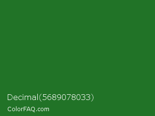 Decimal 5689078033 Color is a dark green color and the nearest color is Forest Green #228b22. Hex code #217327 and RGB value is rgb(33,115,39). In RGB color space, this color is composed of 13% red, 45% green, 15% blue, In CMYK color space, this color is composed of 71% cyan, 0% magenta, 66% yellow , 55% black , In HSL color space, this color has a hue angle of 124° , 55% saturation and 29% lightness.