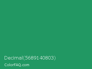 Decimal 5689140803 Color is a normal green color and the nearest color is Eucalyptus #278a5b. Hex code #219863 and RGB value is rgb(33,152,99). In RGB color space, this color is composed of 13% red, 60% green, 39% blue, In CMYK color space, this color is composed of 78% cyan, 0% magenta, 35% yellow , 40% black , In HSL color space, this color has a hue angle of 153° , 64% saturation and 36% lightness.