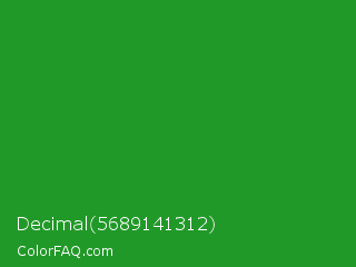 Decimal 5689141312 Color is a normal green color and the nearest color is Forest Green #228b22. Hex code #219928 and RGB value is rgb(33,153,40). In RGB color space, this color is composed of 13% red, 60% green, 16% blue, In CMYK color space, this color is composed of 78% cyan, 0% magenta, 74% yellow , 40% black , In HSL color space, this color has a hue angle of 124° , 65% saturation and 36% lightness.