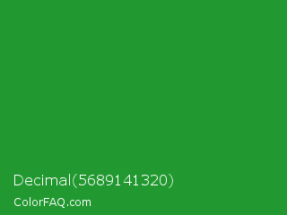 Decimal 5689141320 Color is a normal green color and the nearest color is Forest Green #228b22. Hex code #219930 and RGB value is rgb(33,153,48). In RGB color space, this color is composed of 13% red, 60% green, 19% blue, In CMYK color space, this color is composed of 78% cyan, 0% magenta, 69% yellow , 40% black , In HSL color space, this color has a hue angle of 128° , 65% saturation and 36% lightness.