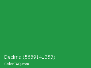 Decimal 5689141353 Color is a normal green color and the nearest color is Sea Green #2e8b57. Hex code #219945 and RGB value is rgb(33,153,69). In RGB color space, this color is composed of 13% red, 60% green, 27% blue, In CMYK color space, this color is composed of 78% cyan, 0% magenta, 55% yellow , 40% black , In HSL color space, this color has a hue angle of 138° , 65% saturation and 36% lightness.