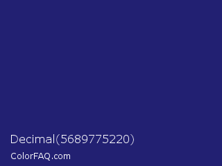 Decimal 5689775220 Color is a dark indigo color and the nearest color is Midnight Blue #191970. Hex code #222072 and RGB value is rgb(34,32,114). In RGB color space, this color is composed of 13% red, 13% green, 45% blue, In CMYK color space, this color is composed of 70% cyan, 72% magenta, 0% yellow , 55% black , In HSL color space, this color has a hue angle of 241° , 56% saturation and 29% lightness.