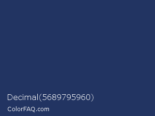 Decimal 5689795960 Color is a dark blue color and the nearest color is Biscay #1b3162. Hex code #223462 and RGB value is rgb(34,52,98). In RGB color space, this color is composed of 13% red, 20% green, 38% blue, In CMYK color space, this color is composed of 65% cyan, 47% magenta, 0% yellow , 62% black , In HSL color space, this color has a hue angle of 223° , 48% saturation and 26% lightness.