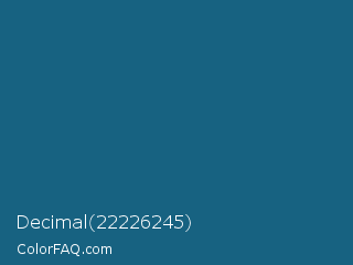 Decimal 22226245 Color is a dark blue color and the nearest color is Blue Sapphire #126180. Hex code #176281 and RGB value is rgb(23,98,129). In RGB color space, this color is composed of 9% red, 38% green, 51% blue, In CMYK color space, this color is composed of 82% cyan, 24% magenta, 0% yellow , 49% black , In HSL color space, this color has a hue angle of 198° , 70% saturation and 30% lightness.
