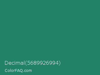Decimal 5689926994 Color is a normal cyan color and the nearest color is Eucalyptus #278a5b. Hex code #228268 and RGB value is rgb(34,130,104). In RGB color space, this color is composed of 13% red, 51% green, 41% blue, In CMYK color space, this color is composed of 74% cyan, 0% magenta, 20% yellow , 49% black , In HSL color space, this color has a hue angle of 164° , 59% saturation and 32% lightness.