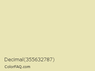 Decimal 355632787 Color is a very light yellow color and the nearest color is Double Colonial White #eee3ad. Hex code #e9e5b5 and RGB value is rgb(233,229,181). In RGB color space, this color is composed of 91% red, 90% green, 71% blue, In CMYK color space, this color is composed of 0% cyan, 2% magenta, 22% yellow , 9% black , In HSL color space, this color has a hue angle of 55° , 54% saturation and 81% lightness.
