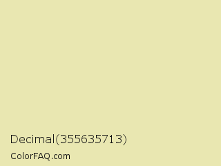 Decimal 355635713 Color is a light yellow color and the nearest color is Double Colonial White #eee3ad. Hex code #e9e7b1 and RGB value is rgb(233,231,177). In RGB color space, this color is composed of 91% red, 91% green, 69% blue, In CMYK color space, this color is composed of 0% cyan, 1% magenta, 24% yellow , 9% black , In HSL color space, this color has a hue angle of 58° , 56% saturation and 80% lightness.