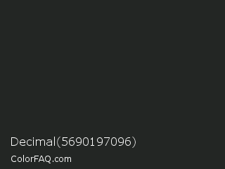 Decimal 5690197096 Color is a very dark green color and the nearest color is Raisin Black #242124. Hex code #232624 and RGB value is rgb(35,38,36). In RGB color space, this color is composed of 14% red, 15% green, 14% blue, In CMYK color space, this color is composed of 8% cyan, 0% magenta, 5% yellow , 85% black , In HSL color space, this color has a hue angle of 140° , 4% saturation and 14% lightness.