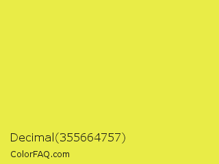 Decimal 355664757 Color is a normal yellow color and the nearest color is Starship #ecf245. Hex code #e9ec47 and RGB value is rgb(233,236,71). In RGB color space, this color is composed of 91% red, 93% green, 28% blue, In CMYK color space, this color is composed of 1% cyan, 0% magenta, 70% yellow , 7% black , In HSL color space, this color has a hue angle of 61° , 81% saturation and 60% lightness.