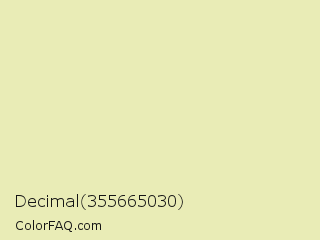 Decimal 355665030 Color is a very light yellow color and the nearest color is Fall Green #ecebbd. Hex code #e9ecb6 and RGB value is rgb(233,236,182). In RGB color space, this color is composed of 91% red, 93% green, 71% blue, In CMYK color space, this color is composed of 1% cyan, 0% magenta, 23% yellow , 7% black , In HSL color space, this color has a hue angle of 63° , 59% saturation and 82% lightness.