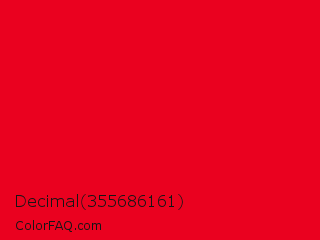 Decimal 355686161 Color is a normal red color and the nearest color is Cadmium Red #e30022. Hex code #ea011f and RGB value is rgb(234,1,31). In RGB color space, this color is composed of 92% red, 0% green, 12% blue, In CMYK color space, this color is composed of 0% cyan, 100% magenta, 87% yellow , 8% black , In HSL color space, this color has a hue angle of 352° , 99% saturation and 46% lightness.