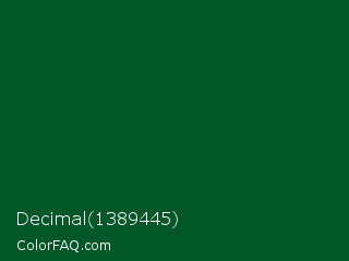 Decimal 1389445 Color is a very dark green color and the nearest color is Camarone #00581a. Hex code #025729 and RGB value is rgb(2,87,41). In RGB color space, this color is composed of 1% red, 34% green, 16% blue, In CMYK color space, this color is composed of 98% cyan, 0% magenta, 53% yellow , 66% black , In HSL color space, this color has a hue angle of 148° , 96% saturation and 17% lightness.