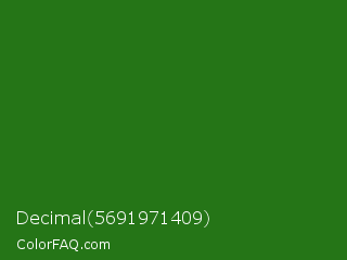 Decimal 5691971409 Color is a dark green color and the nearest color is Bilbao #327c14. Hex code #257517 and RGB value is rgb(37,117,23). In RGB color space, this color is composed of 15% red, 46% green, 9% blue, In CMYK color space, this color is composed of 68% cyan, 0% magenta, 80% yellow , 54% black , In HSL color space, this color has a hue angle of 111° , 67% saturation and 27% lightness.