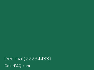 Decimal 22234433 Color is a dark green color and the nearest color is Dark Spring Green #177245. Hex code #176a4d and RGB value is rgb(23,106,77). In RGB color space, this color is composed of 9% red, 42% green, 30% blue, In CMYK color space, this color is composed of 78% cyan, 0% magenta, 27% yellow , 58% black , In HSL color space, this color has a hue angle of 159° , 64% saturation and 25% lightness.