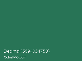 Decimal 5694054758 Color is a normal green color and the nearest color is Amazon #3b7a57. Hex code #287456 and RGB value is rgb(40,116,86). In RGB color space, this color is composed of 16% red, 45% green, 34% blue, In CMYK color space, this color is composed of 66% cyan, 0% magenta, 26% yellow , 55% black , In HSL color space, this color has a hue angle of 156° , 49% saturation and 31% lightness.