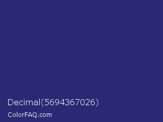 Decimal 5694367026 Color is a normal blue color and the nearest color is St Patricks Blue #23297a. Hex code #292974 and RGB value is rgb(41,41,116). In RGB color space, this color is composed of 16% red, 16% green, 45% blue, In CMYK color space, this color is composed of 65% cyan, 65% magenta, 0% yellow , 55% black , In HSL color space, this color has a hue angle of 240° , 48% saturation and 31% lightness.