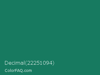 Decimal 22251094 Color is a dark cyan color and the nearest color is Deep Green Cyan Turquoise #0e7c61. Hex code #177a60 and RGB value is rgb(23,122,96). In RGB color space, this color is composed of 9% red, 48% green, 38% blue, In CMYK color space, this color is composed of 81% cyan, 0% magenta, 21% yellow , 52% black , In HSL color space, this color has a hue angle of 164° , 68% saturation and 28% lightness.