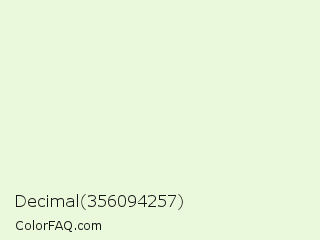 Decimal 356094257 Color is a very light green color and the nearest color is Frost #edf5dd. Hex code #eaf8db and RGB value is rgb(234,248,219). In RGB color space, this color is composed of 92% red, 97% green, 86% blue, In CMYK color space, this color is composed of 6% cyan, 0% magenta, 12% yellow , 3% black , In HSL color space, this color has a hue angle of 89° , 67% saturation and 92% lightness.