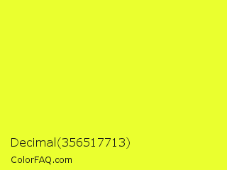 Decimal 356517713 Color is a normal yellow color and the nearest color is Golden Fizz #f5fb3d. Hex code #eaff2f and RGB value is rgb(234,255,47). In RGB color space, this color is composed of 92% red, 100% green, 18% blue, In CMYK color space, this color is composed of 8% cyan, 0% magenta, 82% yellow , 0% black , In HSL color space, this color has a hue angle of 66° , 100% saturation and 59% lightness.