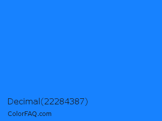 Decimal 22284387 Color is a normal blue color and the nearest color is Blue Crayola #1f75fe. Hex code #1782ff and RGB value is rgb(23,130,255). In RGB color space, this color is composed of 9% red, 51% green, 100% blue, In CMYK color space, this color is composed of 91% cyan, 49% magenta, 0% yellow , 0% black , In HSL color space, this color has a hue angle of 212° , 100% saturation and 55% lightness.