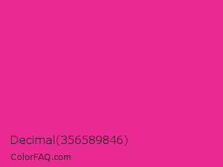 Decimal 356589846 Color is a normal magenta color and the nearest color is Barbie Pink #e0218a. Hex code #eb2b94 and RGB value is rgb(235,43,148). In RGB color space, this color is composed of 92% red, 17% green, 58% blue, In CMYK color space, this color is composed of 0% cyan, 82% magenta, 37% yellow , 8% black , In HSL color space, this color has a hue angle of 327° , 83% saturation and 55% lightness.