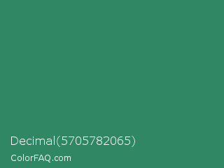 Decimal 5705782065 Color is a normal green color and the nearest color is Eucalyptus #278a5b. Hex code #308763 and RGB value is rgb(48,135,99). In RGB color space, this color is composed of 19% red, 53% green, 39% blue, In CMYK color space, this color is composed of 64% cyan, 0% magenta, 27% yellow , 47% black , In HSL color space, this color has a hue angle of 155° , 48% saturation and 36% lightness.