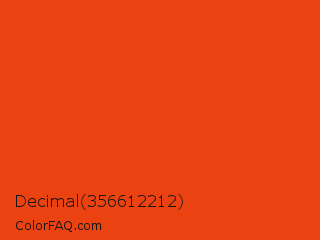 Decimal 356612212 Color is a normal red color and the nearest color is Pomegranate #f34723. Hex code #eb4212 and RGB value is rgb(235,66,18). In RGB color space, this color is composed of 92% red, 26% green, 7% blue, In CMYK color space, this color is composed of 0% cyan, 72% magenta, 92% yellow , 8% black , In HSL color space, this color has a hue angle of 13° , 86% saturation and 50% lightness.