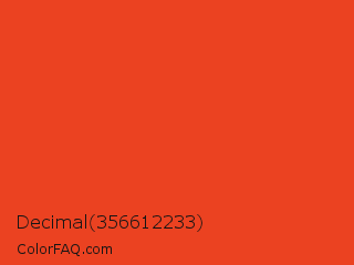 Decimal 356612233 Color is a normal red color and the nearest color is Pomegranate #f34723. Hex code #eb4221 and RGB value is rgb(235,66,33). In RGB color space, this color is composed of 92% red, 26% green, 13% blue, In CMYK color space, this color is composed of 0% cyan, 72% magenta, 86% yellow , 8% black , In HSL color space, this color has a hue angle of 10° , 83% saturation and 53% lightness.