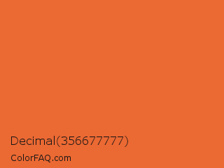 Decimal 356677777 Color is a normal orange color and the nearest color is Deep Carrot Orange #e9692c. Hex code #eb6933 and RGB value is rgb(235,105,51). In RGB color space, this color is composed of 92% red, 41% green, 20% blue, In CMYK color space, this color is composed of 0% cyan, 55% magenta, 78% yellow , 8% black , In HSL color space, this color has a hue angle of 18° , 82% saturation and 56% lightness.