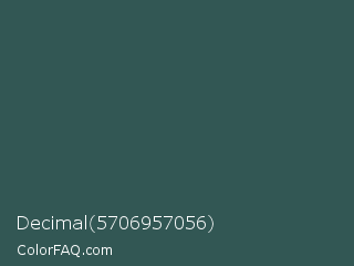Decimal 5706957056 Color is a dark cyan color and the nearest color is Spectra #2f5a57. Hex code #325754 and RGB value is rgb(50,87,84). In RGB color space, this color is composed of 20% red, 34% green, 33% blue, In CMYK color space, this color is composed of 43% cyan, 0% magenta, 3% yellow , 66% black , In HSL color space, this color has a hue angle of 175° , 27% saturation and 27% lightness.