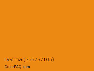 Decimal 356737105 Color is a normal orange color and the nearest color is Golden Bell #e28913. Hex code #eb8913 and RGB value is rgb(235,137,19). In RGB color space, this color is composed of 92% red, 54% green, 7% blue, In CMYK color space, this color is composed of 0% cyan, 42% magenta, 92% yellow , 8% black , In HSL color space, this color has a hue angle of 33° , 85% saturation and 50% lightness.