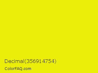 Decimal 356914754 Color is a normal yellow color and the nearest color is Titanium Yellow #eee600. Hex code #ebed0a and RGB value is rgb(235,237,10). In RGB color space, this color is composed of 92% red, 93% green, 4% blue, In CMYK color space, this color is composed of 1% cyan, 0% magenta, 96% yellow , 7% black , In HSL color space, this color has a hue angle of 61° , 92% saturation and 48% lightness.