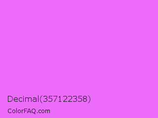 Decimal 357122358 Color is a light magenta color and the nearest color is Heliotrope #df73ff. Hex code #ec6bf8 and RGB value is rgb(236,107,248). In RGB color space, this color is composed of 93% red, 42% green, 97% blue, In CMYK color space, this color is composed of 5% cyan, 57% magenta, 0% yellow , 3% black , In HSL color space, this color has a hue angle of 295° , 91% saturation and 70% lightness.