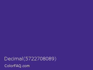 Decimal 5722708089 Color is a normal indigo color and the nearest color is Minsk #3f307f. Hex code #402987 and RGB value is rgb(64,41,135). In RGB color space, this color is composed of 25% red, 16% green, 53% blue, In CMYK color space, this color is composed of 53% cyan, 70% magenta, 0% yellow , 47% black , In HSL color space, this color has a hue angle of 255° , 53% saturation and 35% lightness.