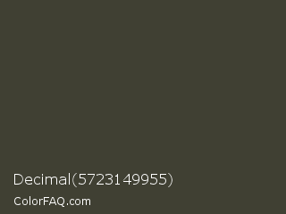 Decimal 5723149955 Color is a dark yellow color and the nearest color is Armadillo #433e37. Hex code #404033 and RGB value is rgb(64,64,51). In RGB color space, this color is composed of 25% red, 25% green, 20% blue, In CMYK color space, this color is composed of 0% cyan, 0% magenta, 20% yellow , 75% black , In HSL color space, this color has a hue angle of 60° , 11% saturation and 23% lightness.