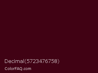 Decimal 5723476758 Color is a very dark rose color and the nearest color is Aubergine #3b0910. Hex code #410214 and RGB value is rgb(65,2,20). In RGB color space, this color is composed of 25% red, 1% green, 8% blue, In CMYK color space, this color is composed of 0% cyan, 97% magenta, 69% yellow , 75% black , In HSL color space, this color has a hue angle of 343° , 94% saturation and 13% lightness.