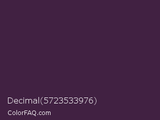 Decimal 5723533976 Color is a very dark magenta color and the nearest color is Blackcurrant #32293a. Hex code #412142 and RGB value is rgb(65,33,66). In RGB color space, this color is composed of 25% red, 13% green, 26% blue, In CMYK color space, this color is composed of 2% cyan, 50% magenta, 0% yellow , 74% black , In HSL color space, this color has a hue angle of 298° , 33% saturation and 19% lightness.