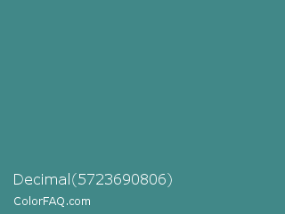 Decimal 5723690806 Color is a normal cyan color and the nearest color is Smalt Blue #51808f. Hex code #418888 and RGB value is rgb(65,136,136). In RGB color space, this color is composed of 25% red, 53% green, 53% blue, In CMYK color space, this color is composed of 52% cyan, 0% magenta, 0% yellow , 47% black , In HSL color space, this color has a hue angle of 180° , 35% saturation and 39% lightness.