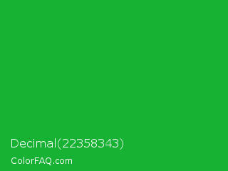 Decimal 22358343 Color is a normal green color and the nearest color is Dark Pastel Green #03c03c. Hex code #17b233 and RGB value is rgb(23,178,51). In RGB color space, this color is composed of 9% red, 70% green, 20% blue, In CMYK color space, this color is composed of 87% cyan, 0% magenta, 71% yellow , 30% black , In HSL color space, this color has a hue angle of 131° , 77% saturation and 39% lightness.